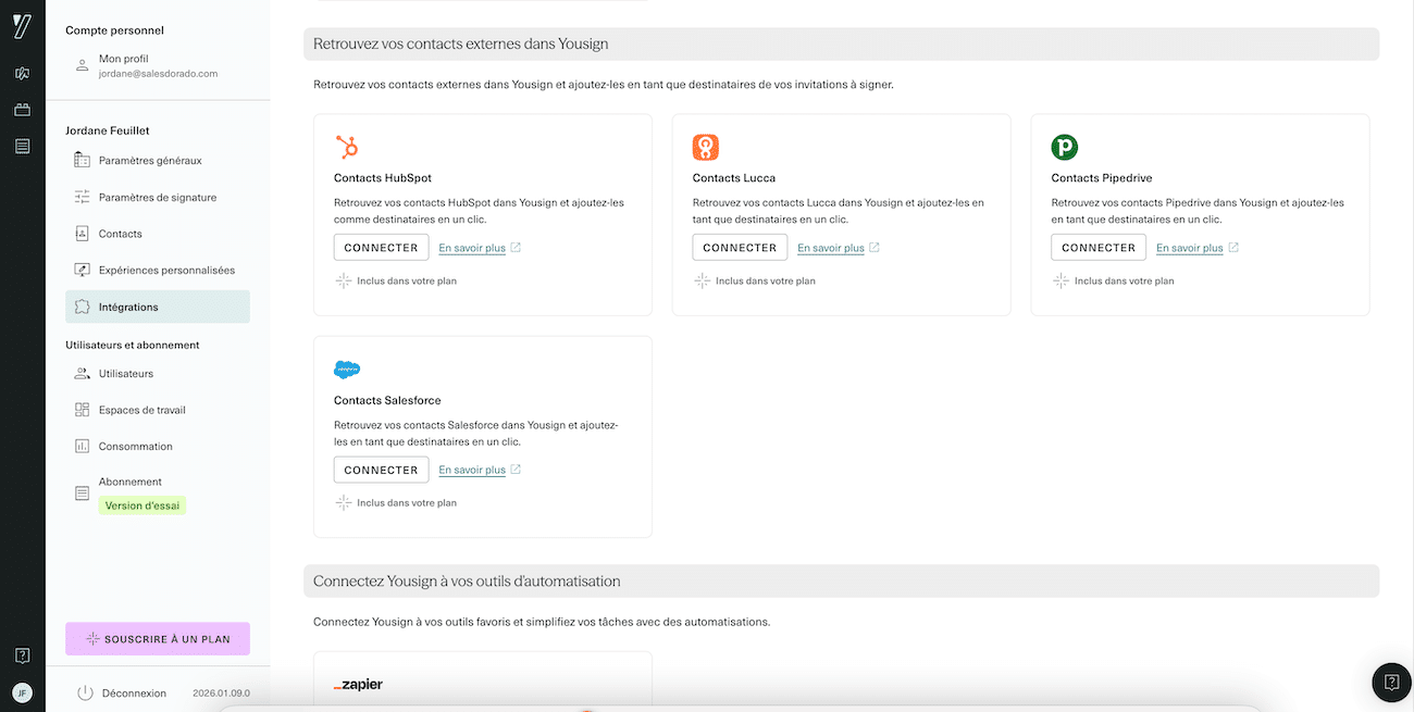 - Automatisation : Zapier, qui déverrouille l’accès à plus de 8 000 applications tiers. Yousign ne propose en revanche pas d’intégration Make. Dommage…