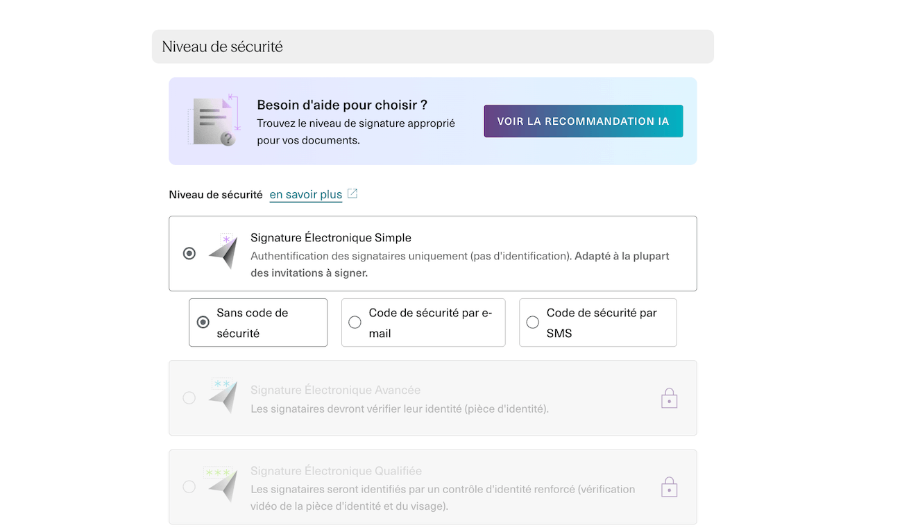 Yousign implémente strictement les standards eIDAS, ce qui structure son offre en trois niveaux de signature :