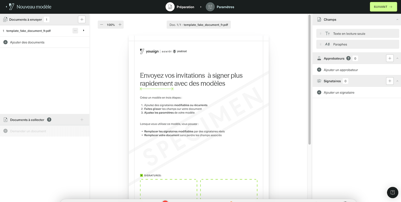 - Les modèles de documents sont indispensables dès que vous signez régulièrement le même type de contrat. Vous créez un template avec les zones de signature positionnées, les champs à remplir, les mentions obligatoires et vous le réutilisez à l’infini. Plus besoin de reconfigurer chaque document depuis zéro.
