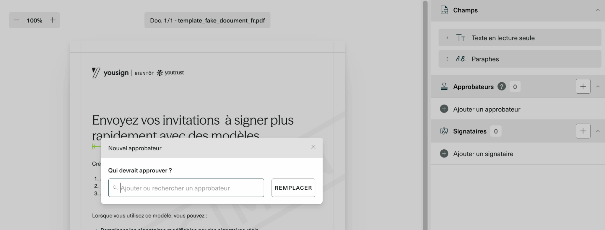 Au-delà de la signature pure, Yousign permet de construire des parcours documentaires adaptés à vos processus internes. C’est souvent là que se joue le gain de temps réel, pas dans l’acte de signature lui-même, mais dans tout ce qui l’entoure.