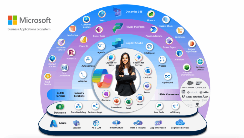 Dynamics 365 n’est pas un simple CRM. C’est une suite de modules métier (ventes, service client, marketing, finance, supply chain, field service…) construite sur la Power Platform de Microsoft et intégrée nativement à tout l’écosystème : Outlook, Teams, SharePoint, Power BI, Power Automate, Azure.
