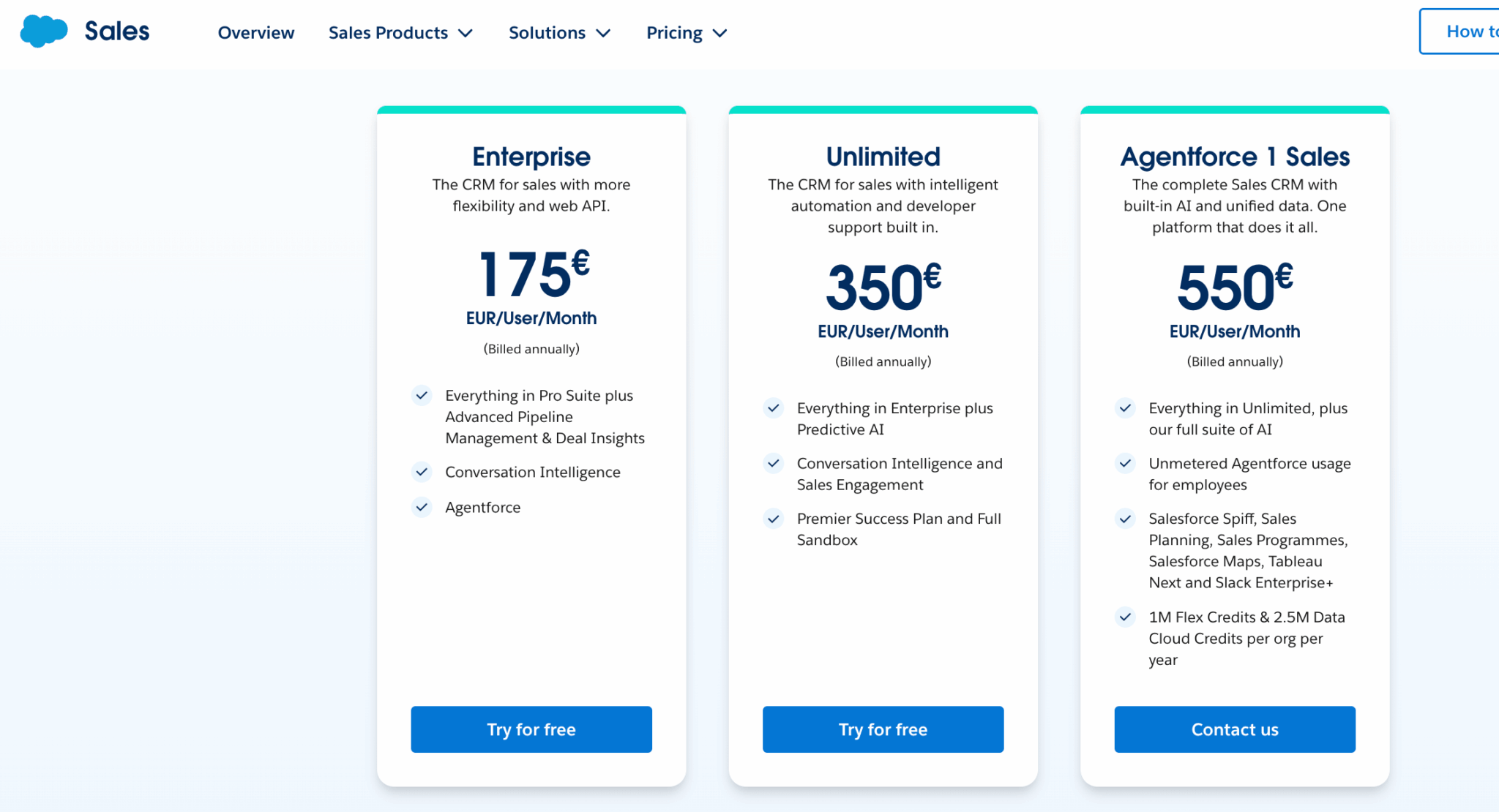 | IA avancée | Copilot inclus dès Sales Enterprise | Agentforce 1 Sales : 550 €/utilisateur/mois |