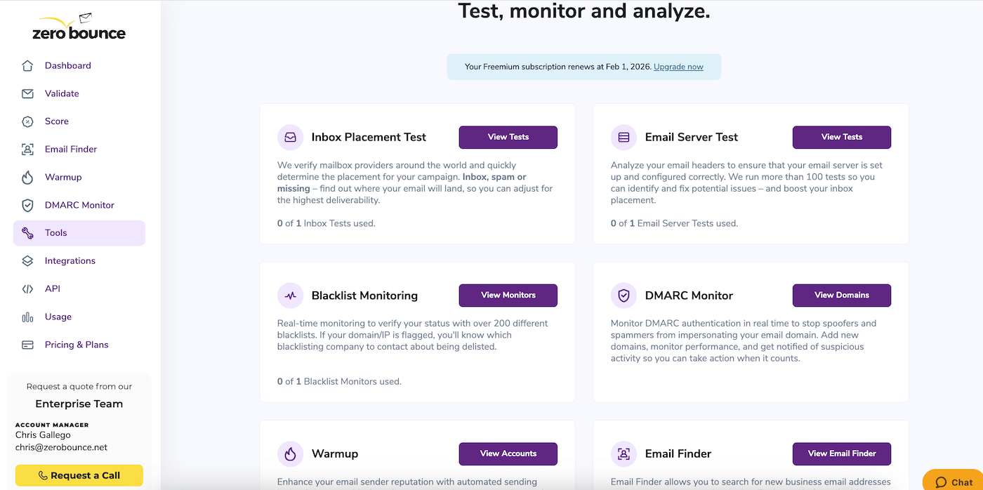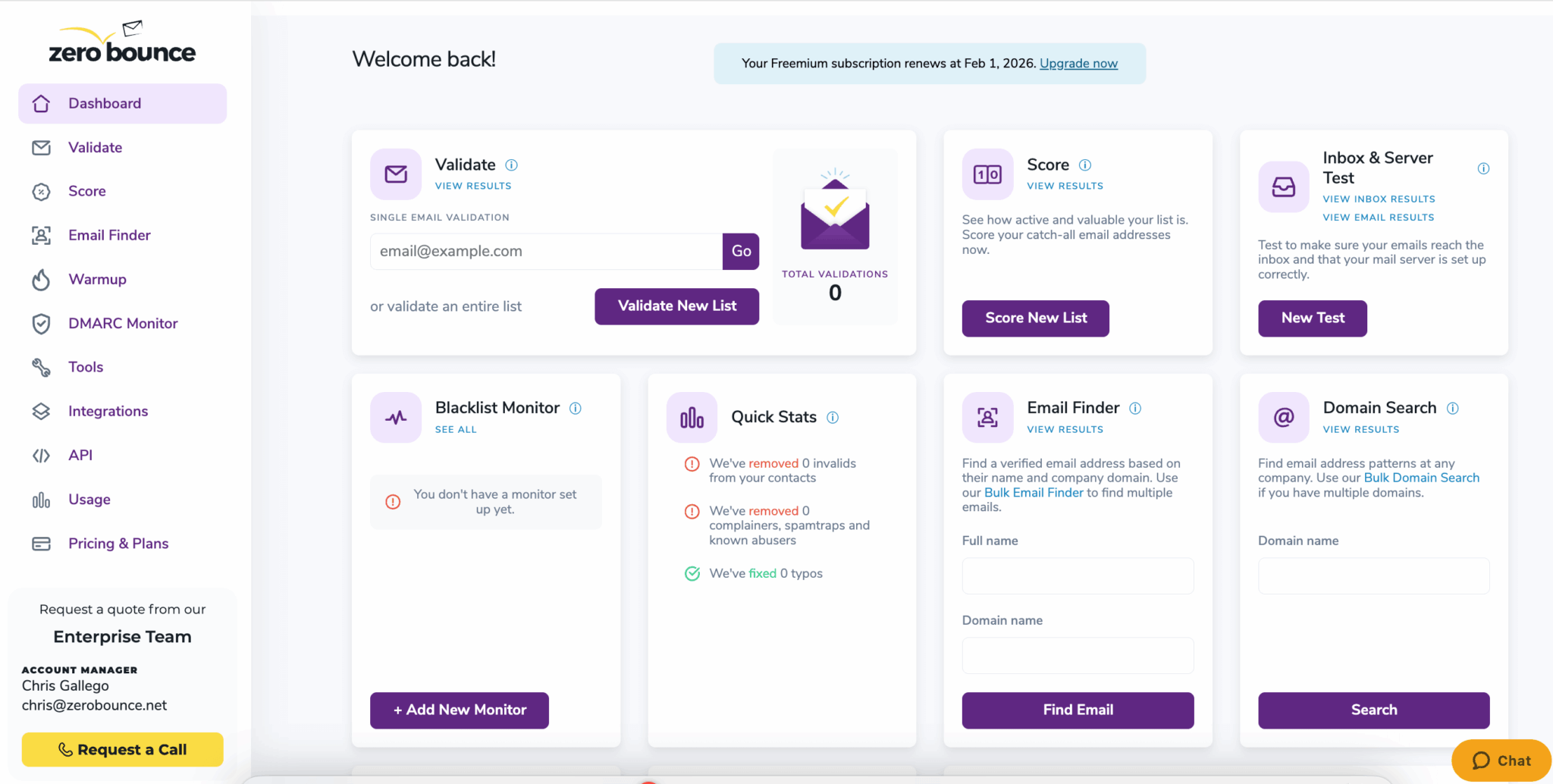 ZeroBounce offers 100 free credits per month for accounts with a professional domain. This is enough to test the tool, not for regular use.