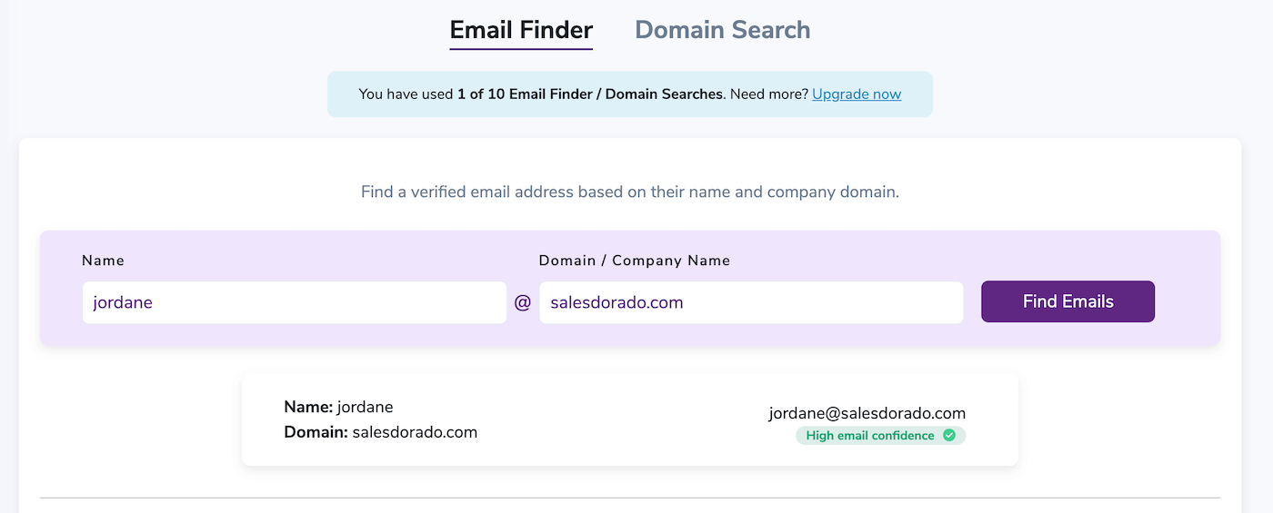 ZeroBounce also offers an Email Finder that allows you to discover email addresses by name and domain. Each search consumes 20 credits and returns a confidence score (HIGH, MEDIUM, LOW).