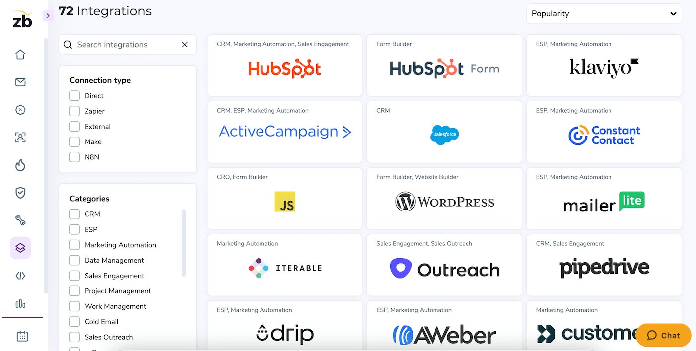 - 70+ native integrations: Salesforce, HubSpot, Mailchimp, Klaviyo, Brevo, Zapier. ZeroBounce connects to virtually the entire modern marketing stack.