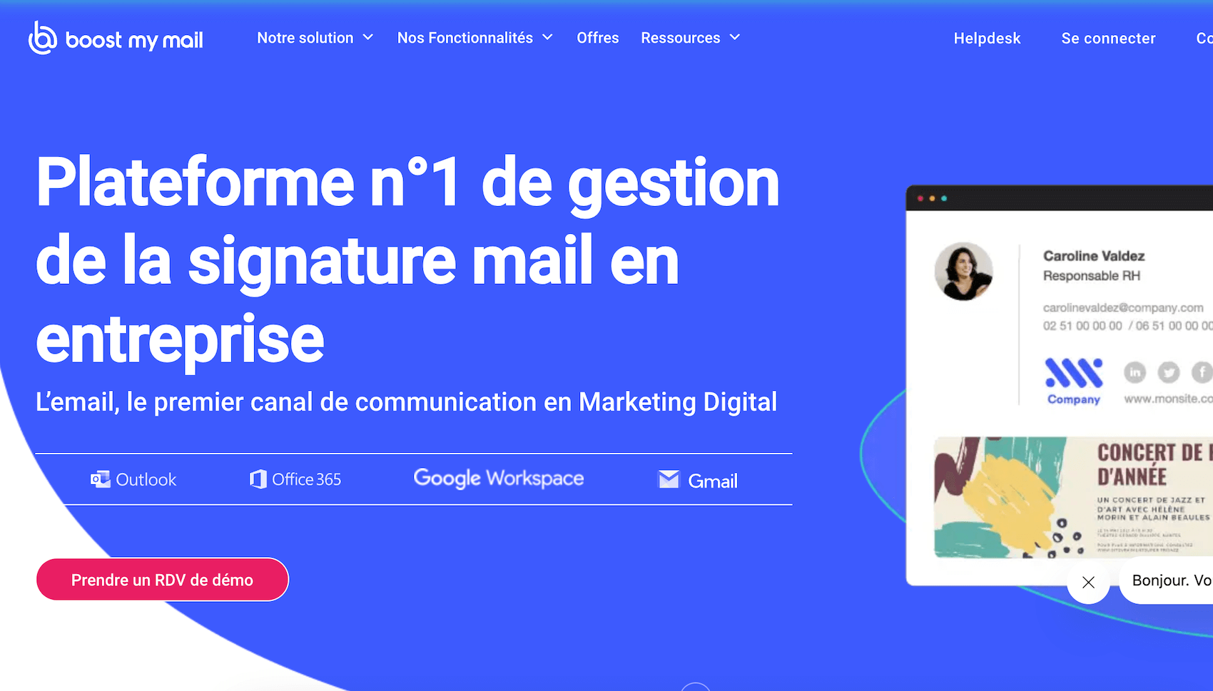 Boost My Mail is another French solution (based in Nantes), with similar features: banners, campaigns, Canva integration, directory synchronization. Prices are not publicly available.
