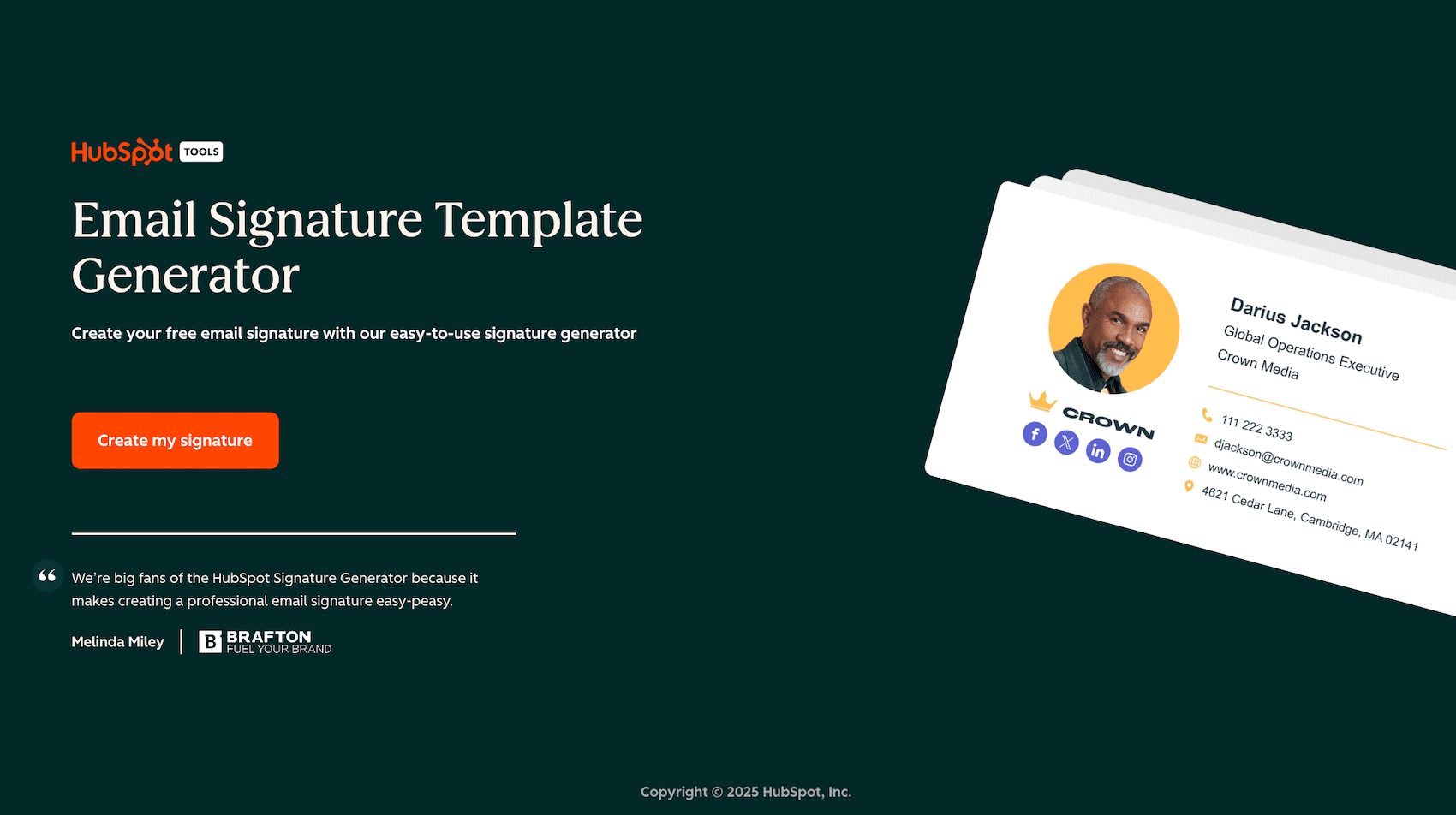 HubSpot’s signature generator is a 100% free tool for creating an individual signature, not a team management solution. You choose a template from the few on offer, fill in your details and copy and paste the signature into Gmail or Outlook.