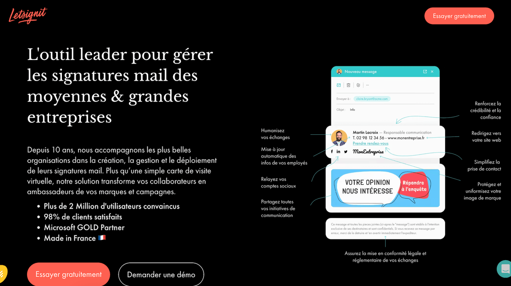 Letsignit has a head start with very large accounts, thanks to its advanced email routing functionalities and a long history in the market. On the price front, Signitic is considerably more aggressive.
