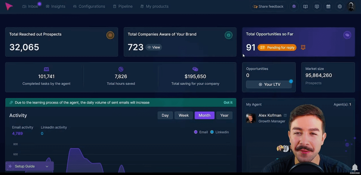 Le principe est simple : vous définissez la stratégie, l’IA exécute tout le reste, de la recherche de leads à la prise de rendez-vous, en passant par l’envoi d’emails, de messages LinkedIn, voire d’appels téléphoniques automatisés.