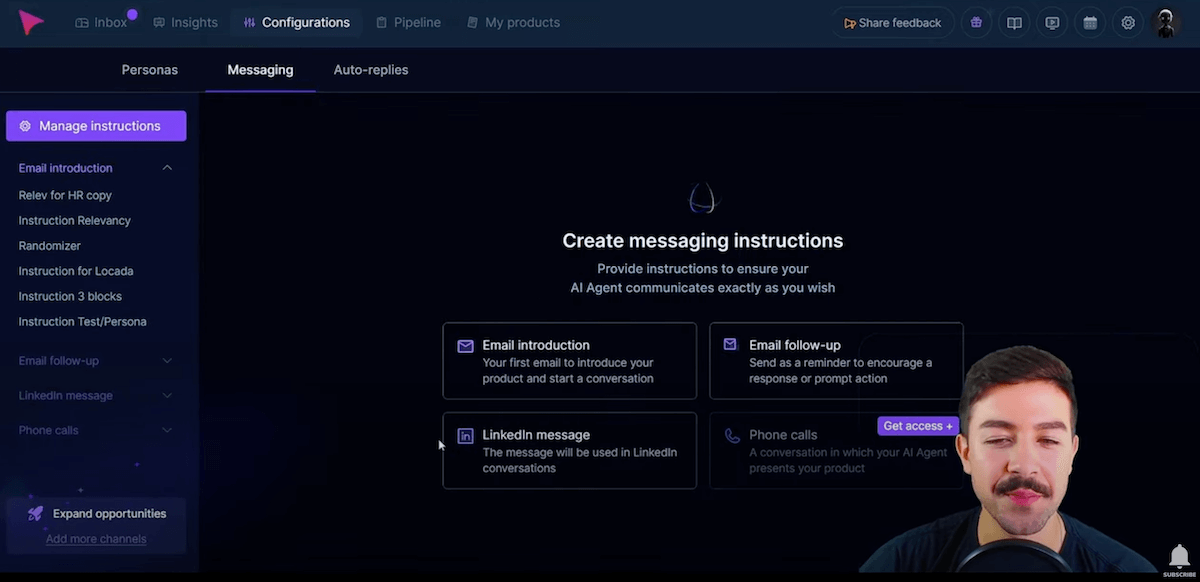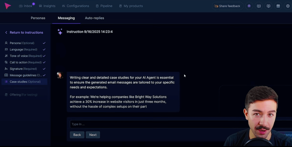 Le niveau de contrôle reste élevé : vous pouvez ajouter vos propres instructions, exclure certains mots, imposer une structure de phrase ou une tonalité. Si un prospect pose une question précise (par exemple sur le prix), vous décidez si l’IA doit répondre seule ou vous notifier pour reprendre la main. En cas de besoin, une alerte vous parvient par email, SMS ou WhatsApp.