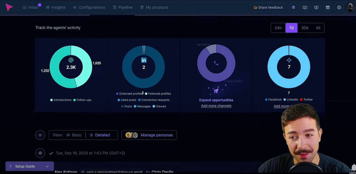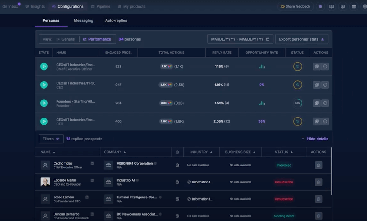 Côté pilotage, la plateforme offre une vue complète sur vos échanges. L’onglet Inbox permet de suivre toutes les conversations actives : messages envoyés, réponses, relances automatiques et prise de rendez-vous. Vous pouvez consulter le détail de chaque contact, son entreprise, son poste, les actions menées par l’IA et l’historique complet des interactions.