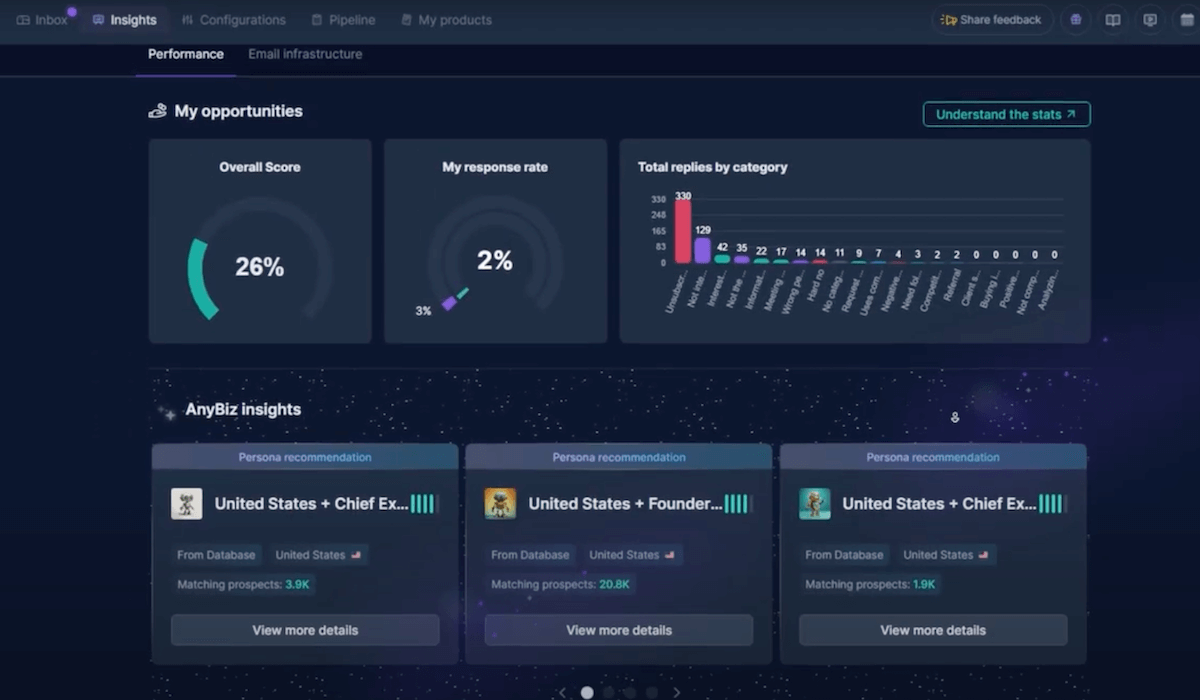 Une fois votre agent configuré, Anybiz déploie automatiquement votre infrastructure de prospection : création et warm-up de domaines, configuration de boîtes mail, paramétrage des suivis et des notifications. Vous pouvez recevoir des alertes dès qu’un prospect répond, qu’une IA ne sait pas quoi répondre ou qu’une opportunité semble mûre.