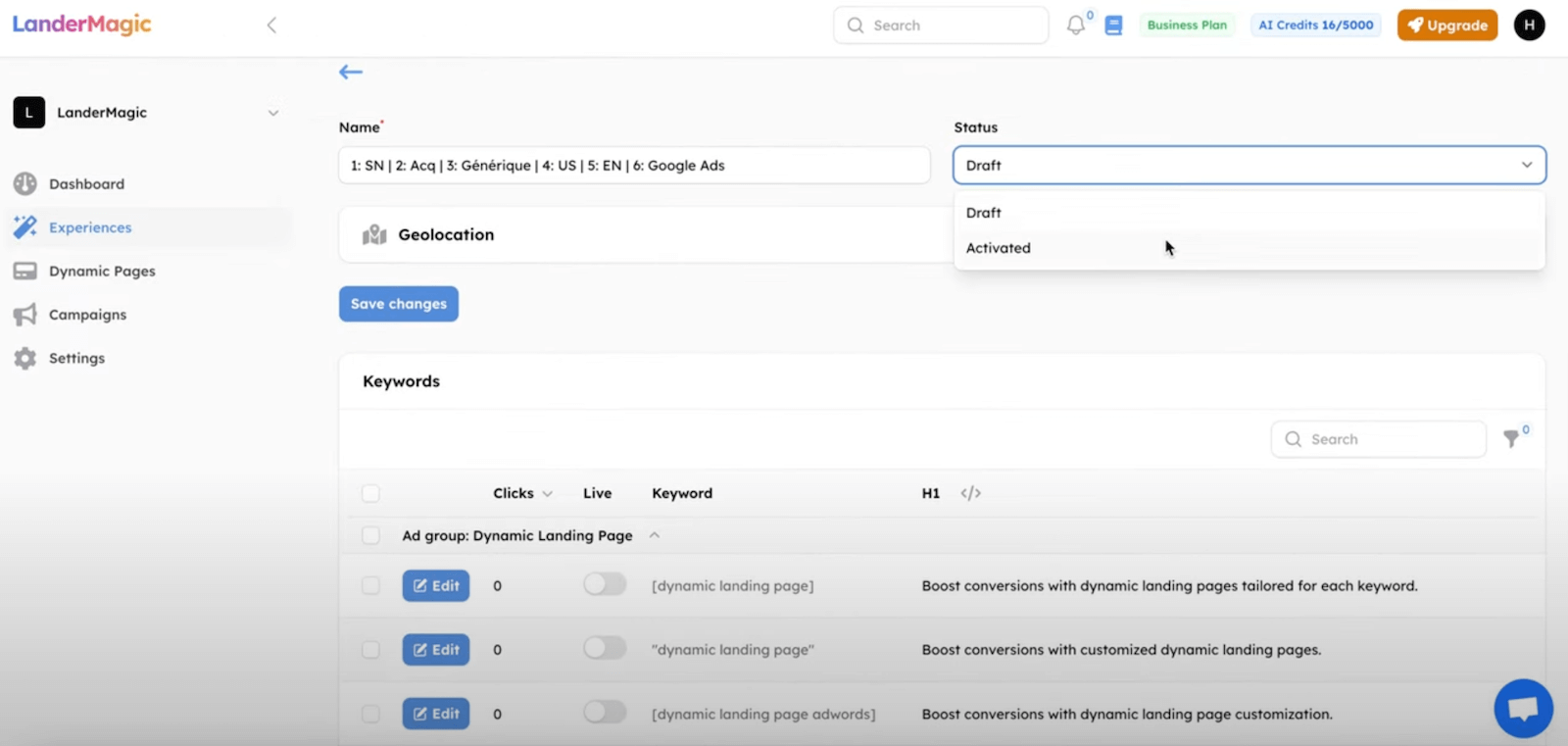 LanderMagic pousse ensuite à centraliser la gestion sur ce modèle unique et à décliner des variantes automatiquement grâce à des variables dynamiques (mot-clé, ville, segment client, etc.). L’IA intégrée peut générer titres, descriptions et alternatives en se basant sur vos premiers inputs et sur une liste de mots-clés. L’idée est de réduire la saisie répétitive, surtout quand on gère beaucoup de campagnes.