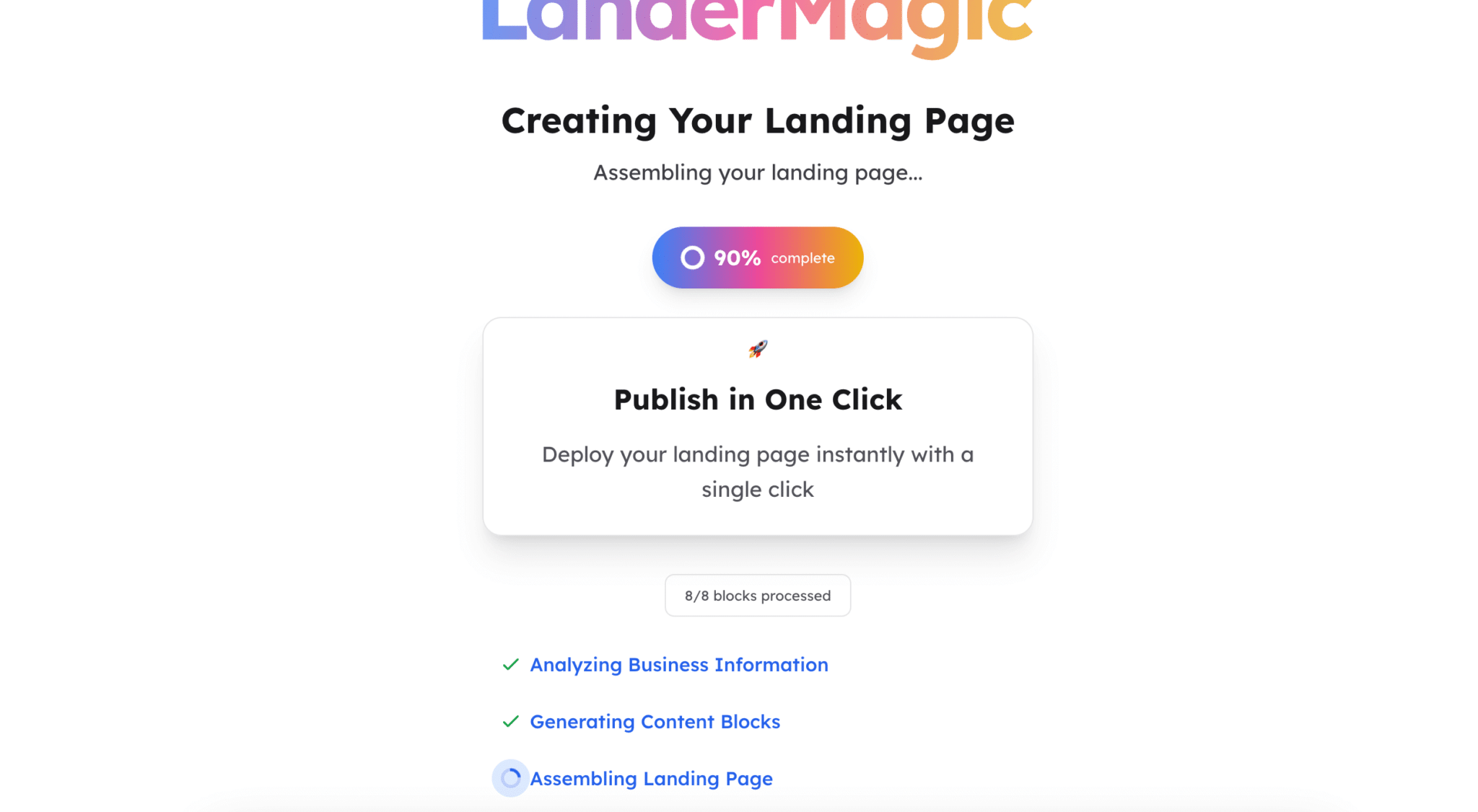 LanderMagic génère ensuite votre landing page. Le processus, au total, prend 1 minute tout au plus :