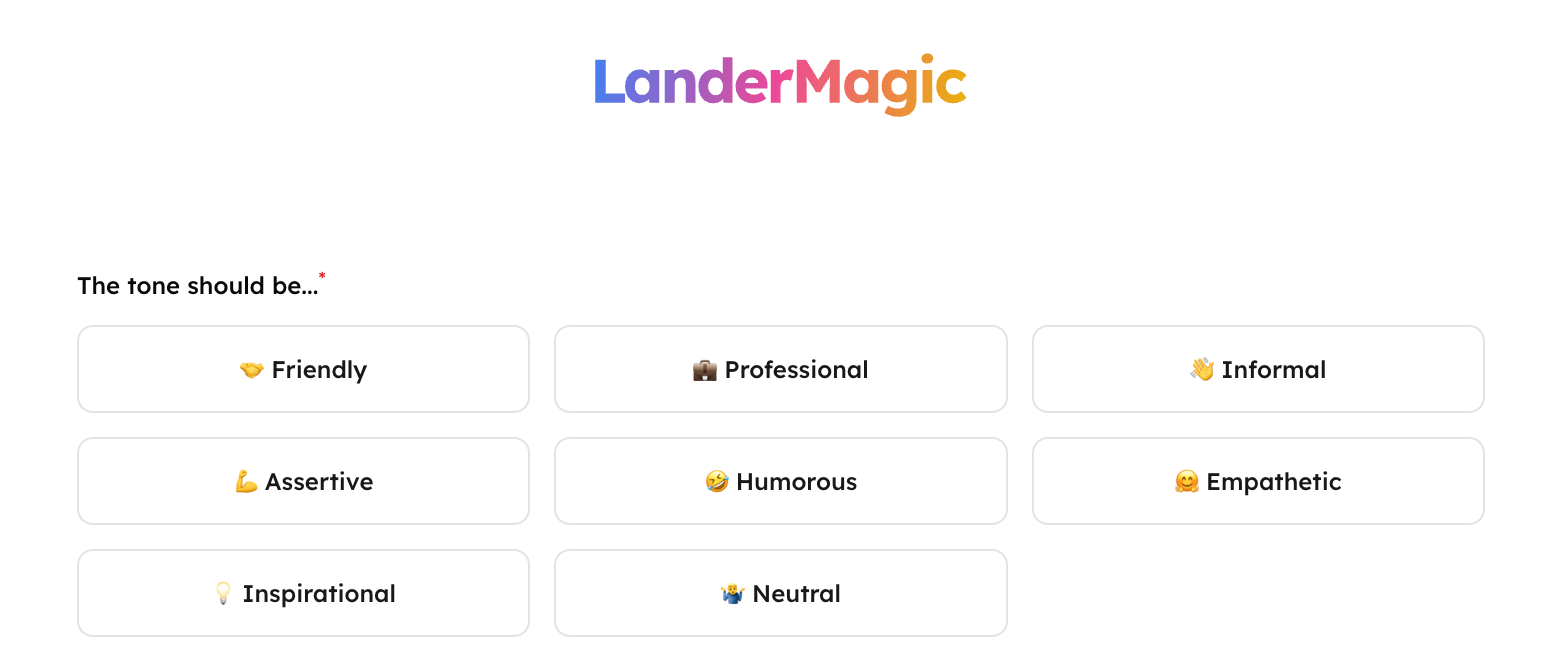 LanderMagic part d’un constat simple, évident, connu de tous : une landing page convertit mieux si elle colle au contexte et à l’intention de recherche. Le problème, c’est qu’il faudrait en théorie créer une infinité de variantes, ce qui est vite ingérable. L’outil propose donc une approche semi-assistée : dès l’ouverture du compte, un assistant vous pose quelques questions sur votre activité, votre audience, votre ton de voix, etc.