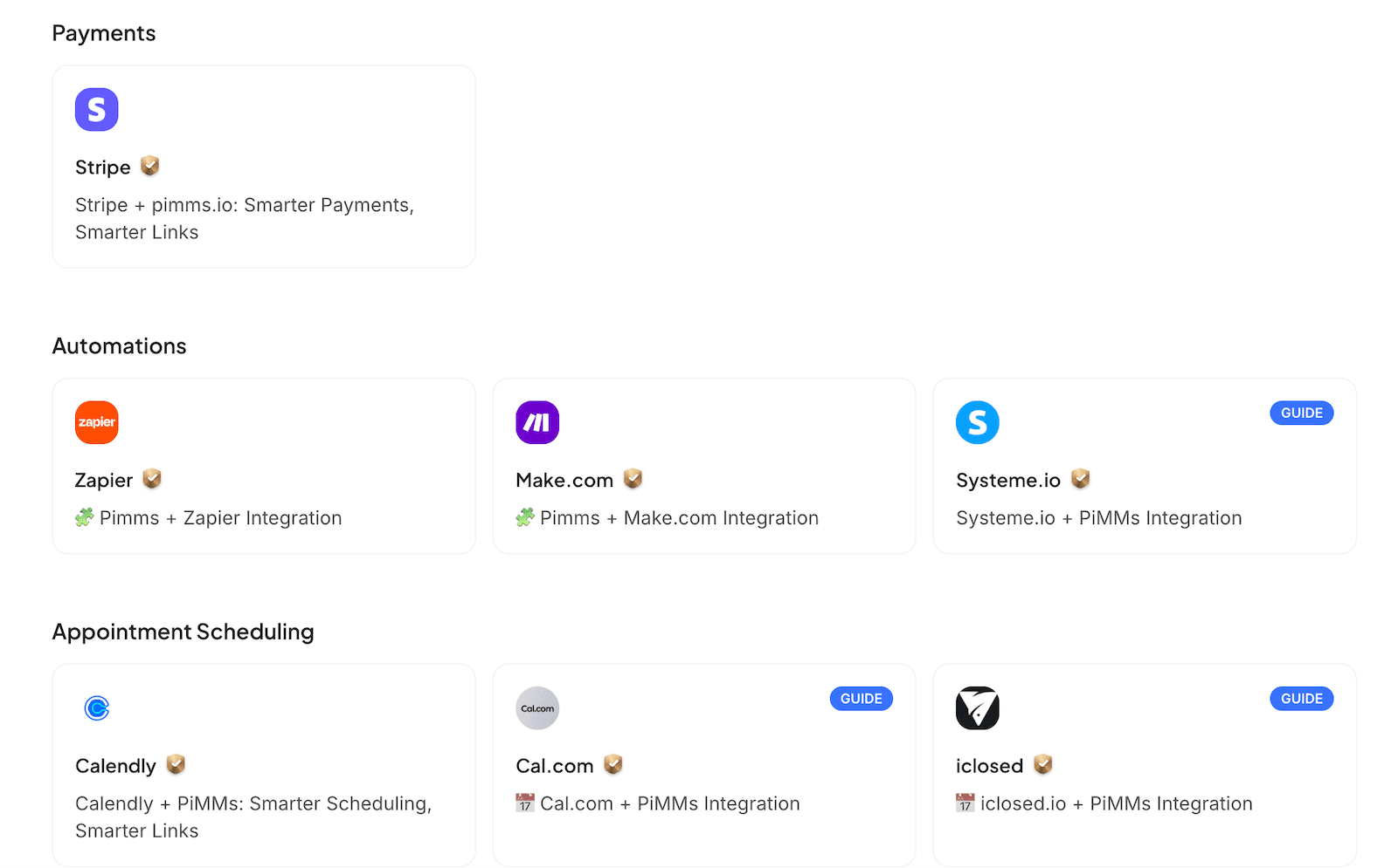 Côté intégrations, Pimms joue la carte de l’essentiel plutôt que de l’exhaustivité. L’outil se connecte aux outils clés de l’écosystème solopreneur et SaaS, sans chercher à couvrir des centaines de cas d’usage :