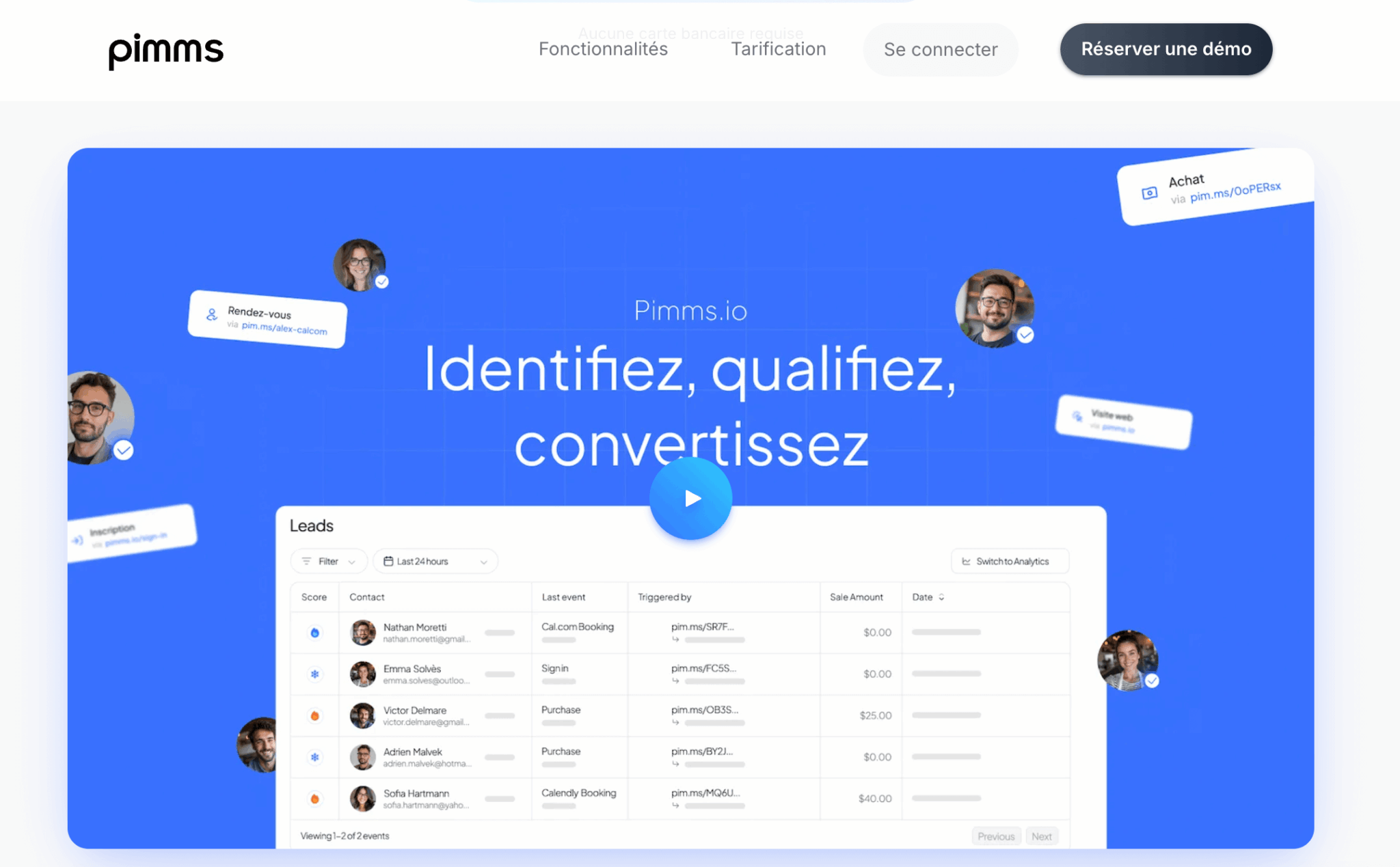 - Deuxièmement, il connecte chaque clic à un revenu réel. Là où Bitly vous dit “vous avez eu 500 clics”, Pimms vous dit “vous avez eu 500 clics, 12 leads qualifiés et 3 200 € de ventes générées”. C’est une philosophie “revenue-first” qui change la façon dont vous analysez vos efforts marketing.