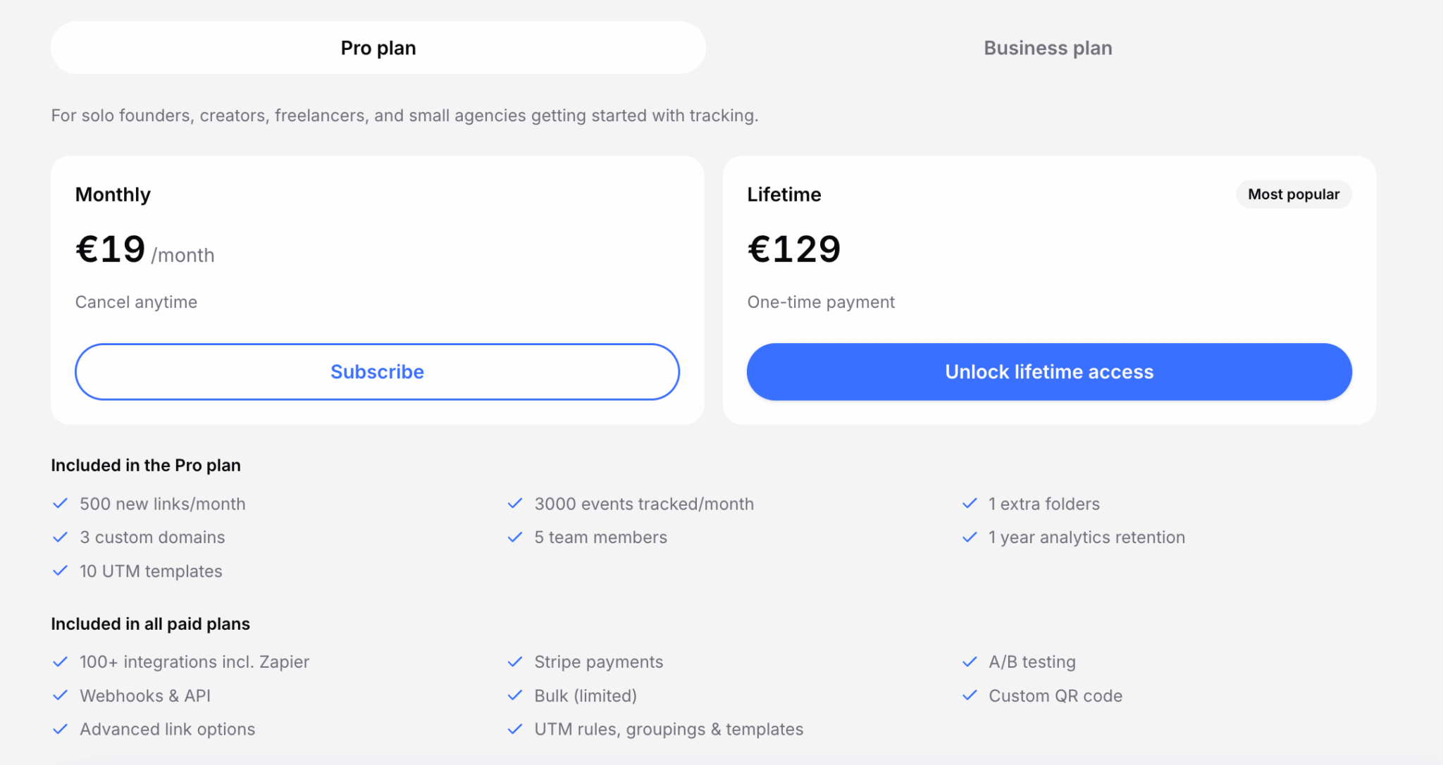 | Pro (lifetime) | 129 € (une fois) | 500 | Mêmes features, paiement unique, 1 an de rétention |