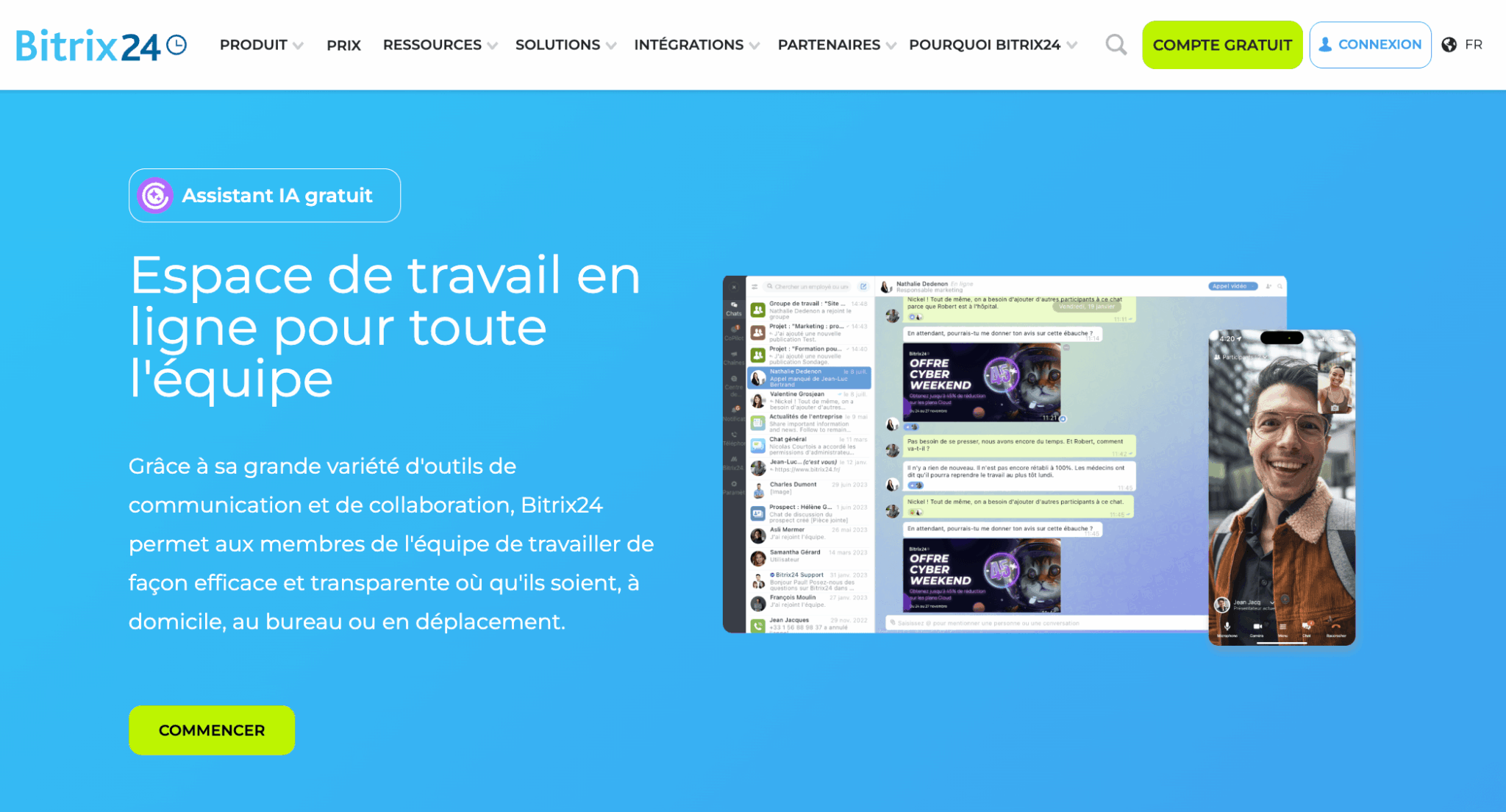Bitrix24 propose un plan gratuit sans limite d’utilisateurs. Testez le chat, la visio, la téléphonie et le fil d’actualité dans un seul espace, sans engagement.