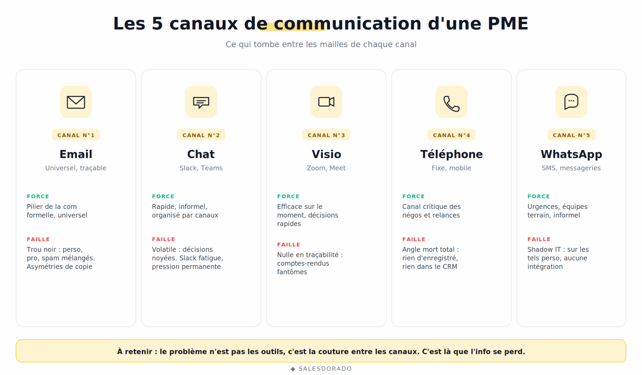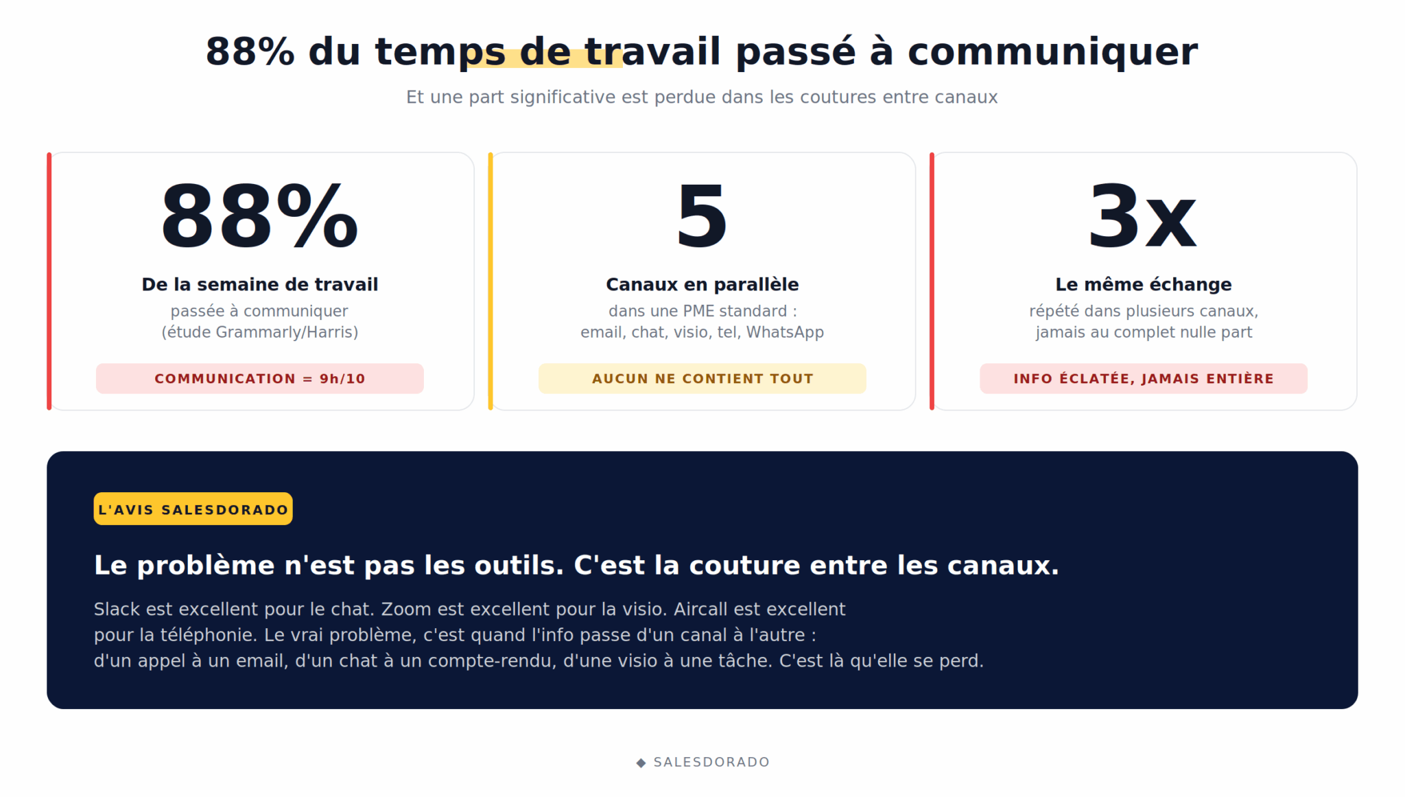 L’avis Salesdorado Le problème n’est pas les outils pris isolément. Slack est excellent pour le chat. Zoom est excellent pour la visio. Aircall est excellent pour la téléphonie. Le problème, c’est la couture entre les canaux. C’est là que l’information se perd : quand elle passe d’un appel téléphonique à un email, d’un chat à un compte-rendu, d’une visio à une tâche. C’est cette couture qu’il faut supprimer.