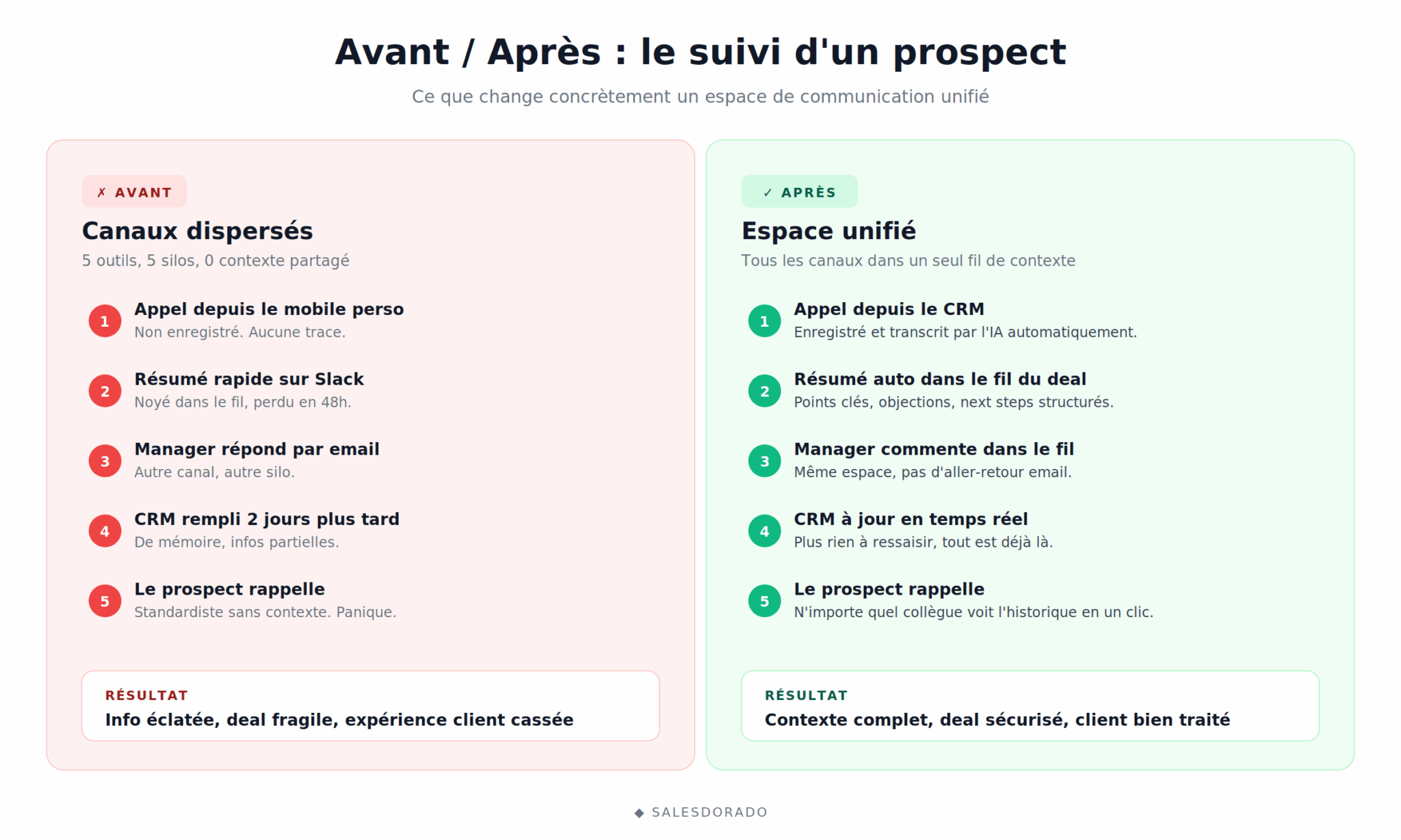 Après (espace de communication unifié) : Le commercial appelle depuis la téléphonie intégrée au CRM. L’appel est automatiquement enregistré et transcrit par l’IA. Le résumé (points clés, objections, prochaines étapes) se poste dans le fil du deal CRM. Le manager le voit instantanément, commente directement. Si le prospect rappelle, n’importe quel collègue voit l’historique complet en un clic.