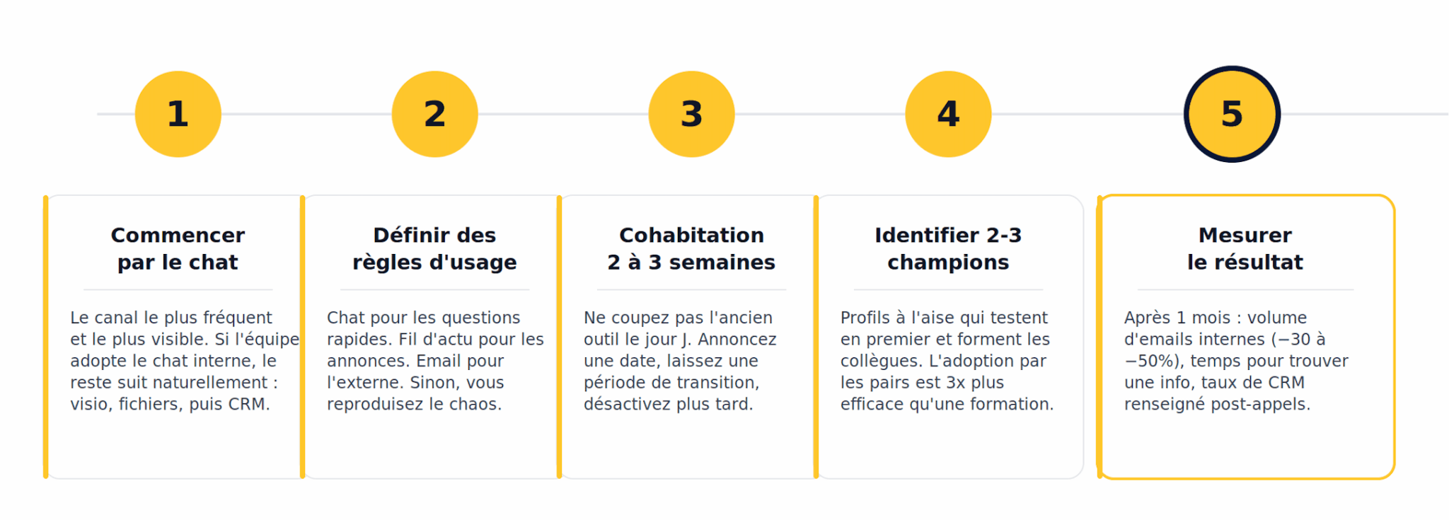 - Définissez des règles d’usage claires. “On utilise le chat pour les questions rapides. Le fil d’actualité pour les annonces. L’email uniquement pour les échanges avec l’extérieur. Les appels pour les sujets sensibles.” Sans ces règles, vous reproduirez le chaos dans un nouvel outil.