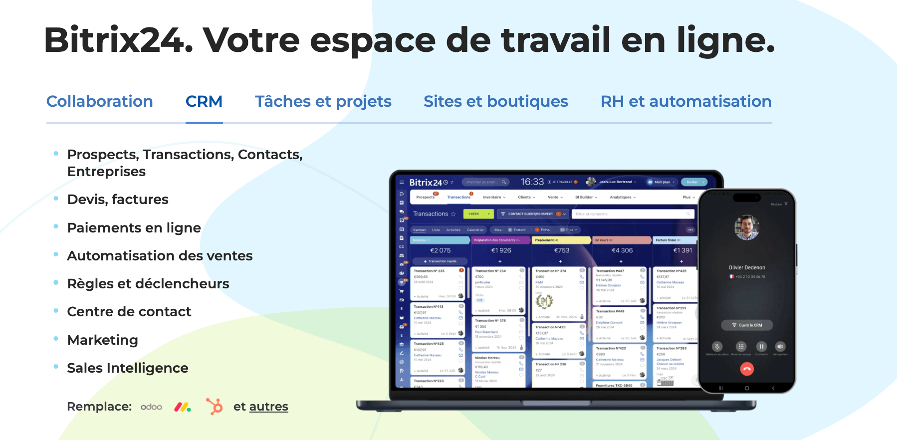 • Bitrix24 : la consolidation maximale. CRM + chat + visio + téléphonie + gestion de projet + stockage + IA CoPilot dans un seul abonnement forfaitaire (99€/mois pour 50 utilisateurs). C’est l’option la plus radicale : elle remplace 6-7 outils d’un coup. L’interface est dense et la courbe d’apprentissage est réelle, mais le rapport fonctionnalités/prix est imbattable. C’est notre recommandation pour les PME qui veulent vraiment simplifier.