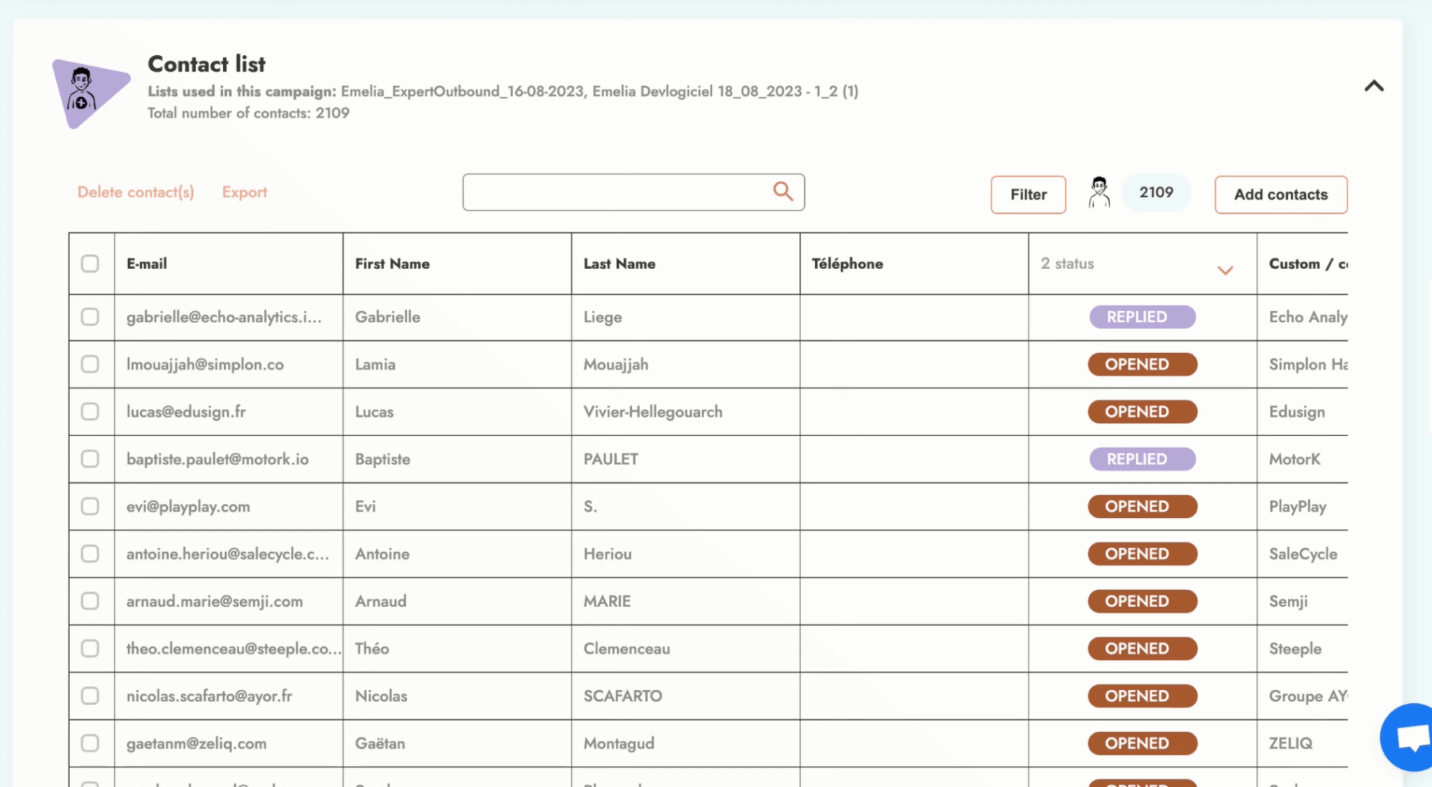 Côté CRM, Emelia reste léger, on ne va pas se mentir, mais bien pensé. Vous pouvez suivre le statut de vos leads,
