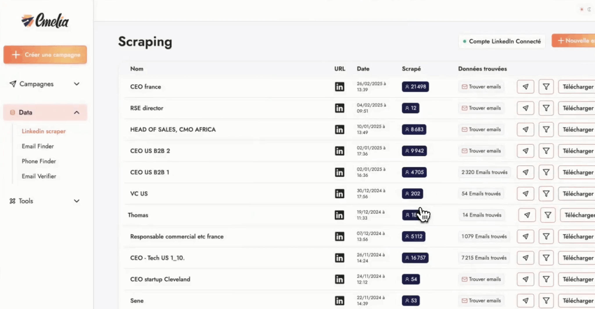 C’est sans doute la brique la plus différenciante d’Emelia. L’outil embarque un moteur de scraping LinkedIn Sales Navigator illimité, accessible dès le plan “Start”.
