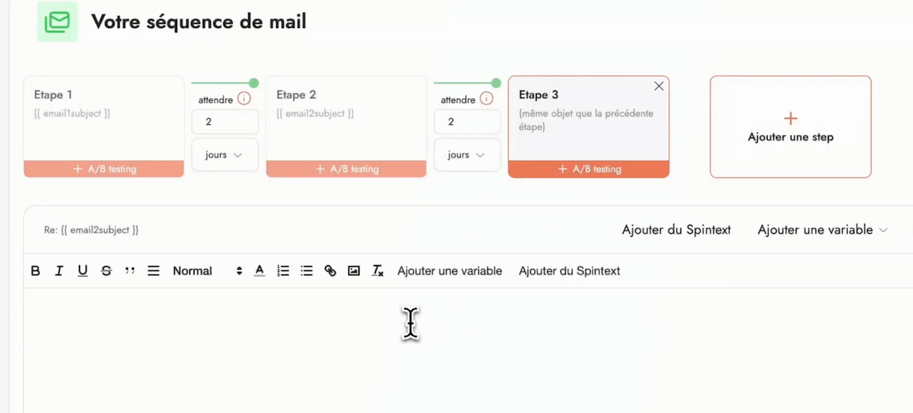 Chaque étape peut être personnalisée : délai entre les envois, variables de personnalisation (prénom, poste, entreprise), choix de l’expéditeur ou de la boîte utilisée, objet, A/B test sur les messages, règles de désactivation (si réponse, si ouverture, si clic).