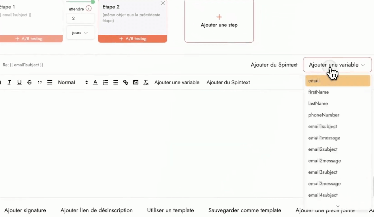 faire du spintax (variations automatiques de phrases) et tester plusieurs objets ou formulations en A/B test.